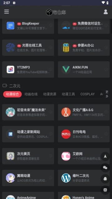 宅仓库APP是一款收集各种有趣应用的软件资源分享平台,软件涵盖了多种在线工具可以免费使用,动漫、二次元、ACG资讯、软件下载等多个领域的资源。用户可以在这里找到自己喜欢的动漫作品、游戏资源、软件工具等,全程免费畅享,下载飞速。