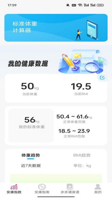 1、使用计算器来计算出自己的标准体重,获取身体健康质量指数。