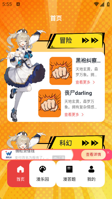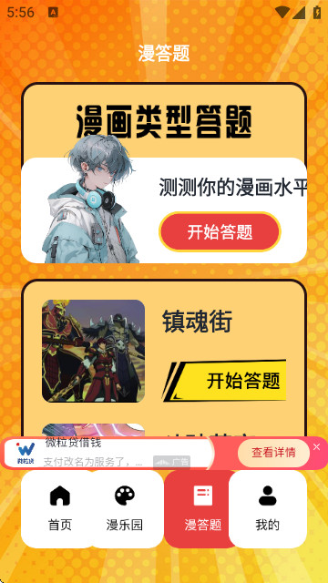 4.用户可以在漫画答题页面中获取各种漫画知识题目进行答题;