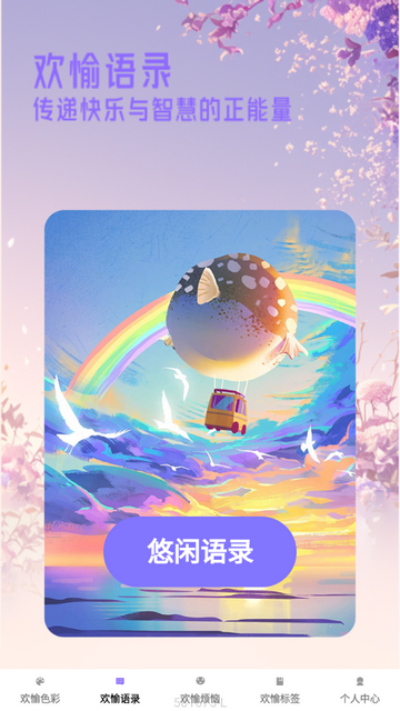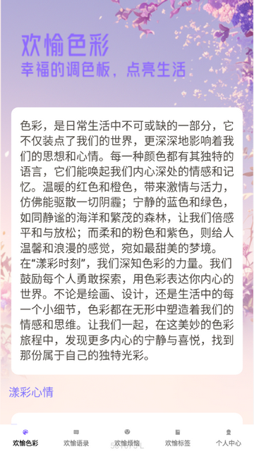欢愉闲看app是一款为你提供心灵鸡汤的软件,提供丰富的色彩科普知识,深入介绍不同色彩的心理影响和应用效果,色彩不仅是视觉上的享受,更能够影响人的情绪和心理状态,可以随时在线进行分析查看,可以让你用文字去疗伤,让你随时振作起来,还可以随时去发现生活的美好和希望。
