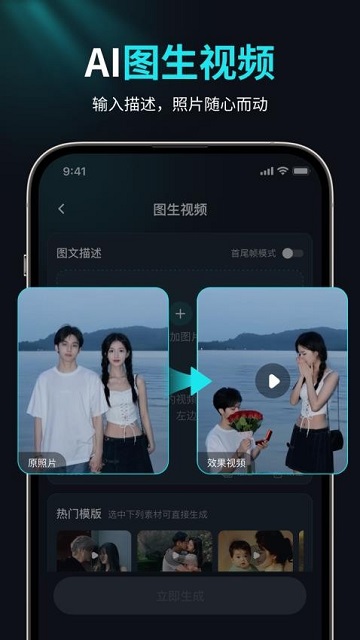 为用户提供了强大的生成工具,方便用户一键生成需要的特效视频,实现文生视频和图生视频。