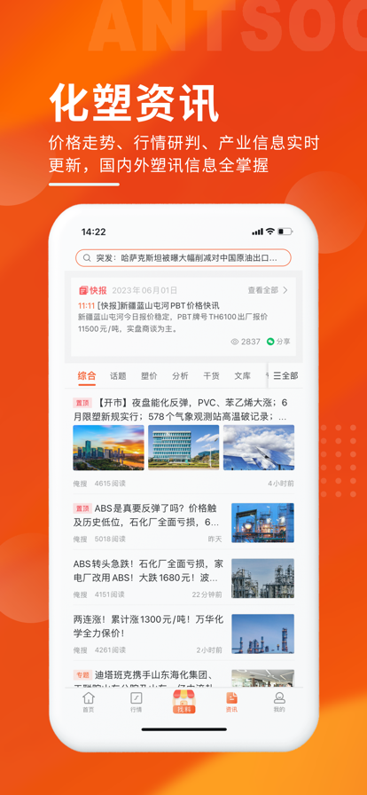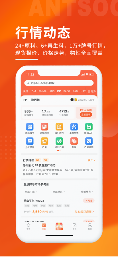 ·俺搜实时更新20+品类、40+城市、400+厂家、10000+塑料牌号现货报价,可查看市场均价、出厂均价、区域均价、上游单体均价、进出口量、产量、库存、开工率、利润等近1年历史数据走势,更全、更专业的分析预测监控价格波动,未来走势不迷茫!·俺搜实时更新供应商出售产品,12W+出售信息,4500W+曝光量,随时随地都能询盘,海量采销资源助力采购商和供应商实现商机撮合,高效省力找料!