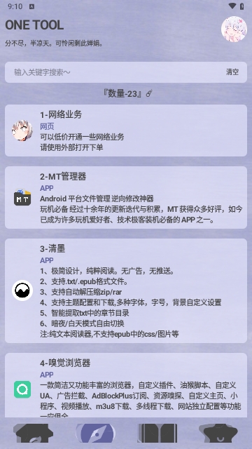 ONE TOOL工具箱APP是一款十分不错的手机工具箱软件,这款软件中所聚集的手机工具资源类型十分多样,能够很好的满足大家不同的日常使用需求,适用于多种场景,此外还提供了影视、壁纸、直播、动漫、小说漫画等多种在线资源给大家浏览观看。