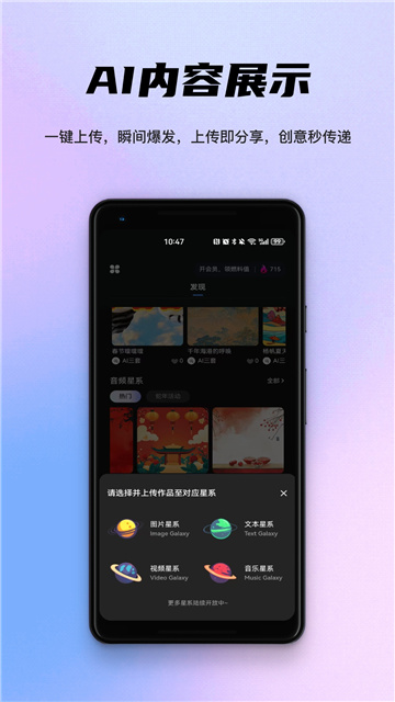 灵感星海app是一款最新上线的可以快速在线进行AI创作软件,汇集诸多作品和版权内容,可自由在应用中查看,了解更多优质的内容,提供AI智能聊天功能,用户可以与AI进行实时互动,获取信息、知识和创作灵感,可以帮助更多用户独立去创作作品,也可以享受创作的乐趣。