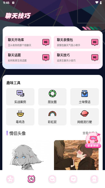 2、土味情话:谈恋爱怎么能少得了土味情话呢?不同场合不同话题的心动情话,任你选择,拉进彼此的距离,迅速脱单处CP。