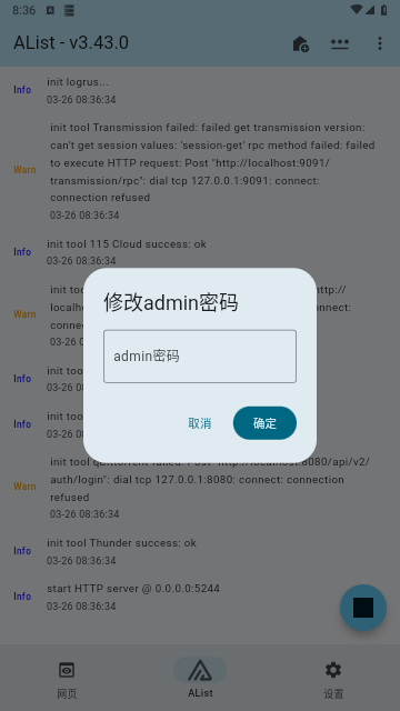 3、接着,点击左下角网页,登录alist,添加网盘。同一局域网设备可以访问http://[手机局域网IP]:5244,具体设置方法与Coreelec下一样,参考官方文档https://alist.nn.ci/zh/guide/。注意,核心是要取得网盘的令牌或者Authorization。