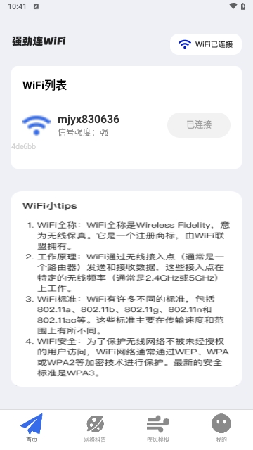 强劲连WiFi手机版app这是一款拥有卓越网络安全管理和智能优化提速功能服务的应用软件,在这里具备详情的WIFI网络列表,让大家可以轻松连接不同的WIFI网络信号,内置网络的连接和访问管理非常便利,能够帮助使用者更好管理上网情况。