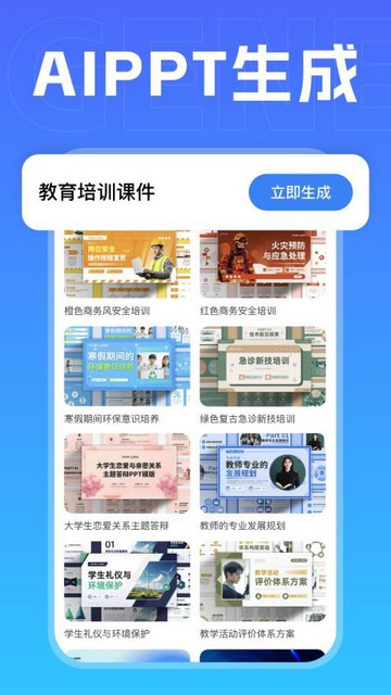 1、在PPT生成板块,可自行选择模板生成需要的PPT文档文件。