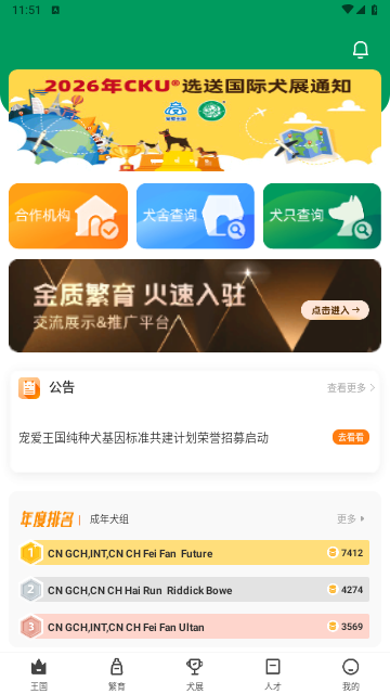 查看即将开展的赛事以及查看自己的狗狗参加过的赛事和成绩。(预告Dog show官方赛事,为带犬只参赛的会员建立赛事介绍、在线报名、成绩查询的快捷通道。