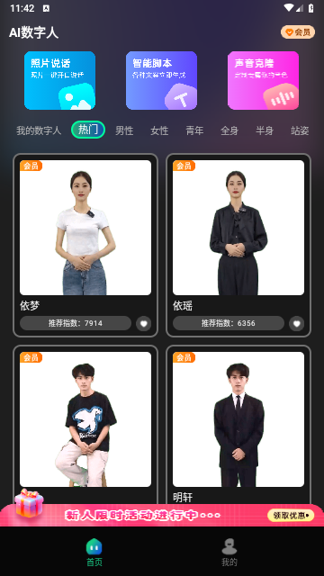 AI数字人是一款基于先进人工智能技术的数字人生成工具,集成了海量数字人形象,支持AI写脚本、一键成片、AI配音和形象克隆等功能。用户可以通过上传照片或视频创建独一无二的数字人形象,并用于个人品牌推广和短视频制作,快来下载使用吧。
