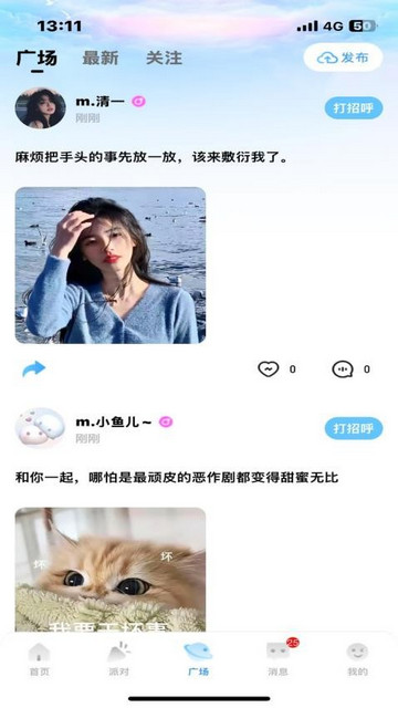可实时关注最新发布的广场动态,知道网友的最近生活,并能在线点赞评论和分享;