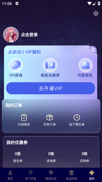 星愈堂是一款专为星座爱好者设计的综合性应用,由杭州浊龙科技有限公司推出。它融合了现代占星学、深度心理学和大数据案例库,为用户提供精准的星座性格分析及多样化的心理咨询服务。通过一对一的情感关系处理、情感疗愈等服务,用户能够得到情感上的支持和帮助。此外,应用还提供星盘解析功能,帮助用户更好地理解自己的性格特点和潜力,支持相关课程学习,促进自我成长;用户还可以通过情感社区与他人互动交流,获得心理上的疗愈。