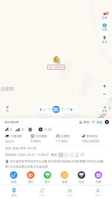 车辆定位与地图显示:用户可以实时查看车辆的当前位置,并通过地图显示车辆行驶轨迹,适用于车队管理及个人驾驶安全。