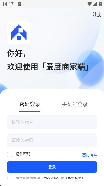 1、下载并打开爱度商家端APP,就能选择手机号或密码登录使用;