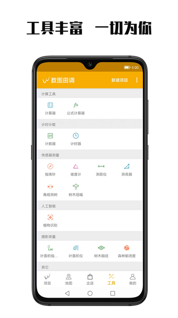 数据采集表单直连工具箱。这些工具包括地图、公式计算器、计时器、指南针、坡度计、测距仪、测高器、角规测树、叶面积指数仪、叶面积仪、树木胸径测量、树木冠幅测量、植物识别,等等。