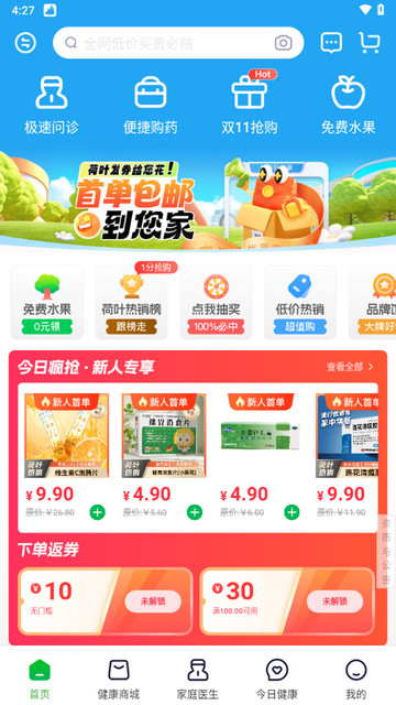 1、荷叶健康,三甲名医在线问诊在线购药小时达。