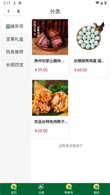2、涵盖多种农产品,包括特色肉粽、土腊肉、绿壳蛋、小米精品等,都可以直接下单。