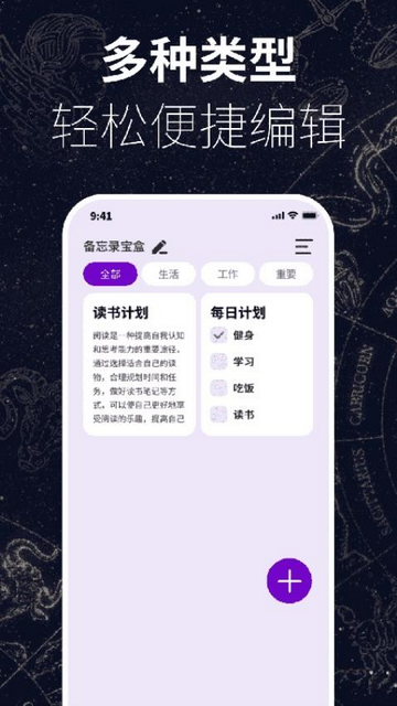 创享宝盒app支持用户可以轻松记录备忘录,能够让你随时记录标签,更好的管理,这里多种类型都可轻松编辑,快捷输入,帮助用户个性化的记录,对自己的便签背景也可以随时设置,精美展示,并且用户也可以查看星座运势,对每日行星能量都可以提示,轻松的查看。