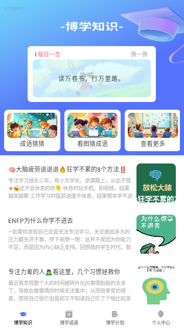 博学小天才App这款学习软件带给用户们最好的服务,多种服务没有任何的限制的,多种学习服务就放心的使用就好了绝对让用户们满意,提高自己的学习高效性;非常有趣的成语猜猜和看图猜成语等游戏学习模式,可尽情在应用中体验,以娱乐般的方式学习,需要的朋友们快来下载吧。