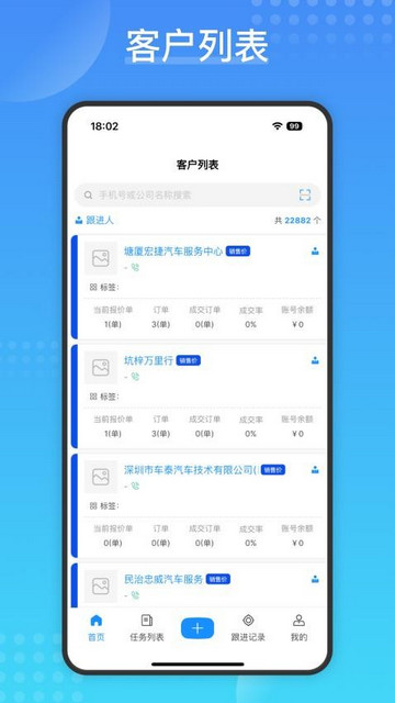 可通过输入手机号或公司名称的方式快速查找客户,便于精准找到并立即查看;