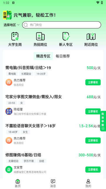 一款非常好用的兼职找工作应用,其专为18岁以上的群体打造,不为未成年人提供服务,它不仅提供兼职信息,还包括校内活动和灵活兼职的内容,对于大学生来说,这样的服务非常方便,因为他们可以根据自己的和需求选择不定时、短时或者周末兼职。