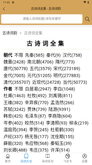 2、丰富的词库,提供唐诗、宋词、元曲、古诗、楚辞、全唐诗、全宋词等经典之作,帮助你学习诗词的注解、释义和鉴赏。