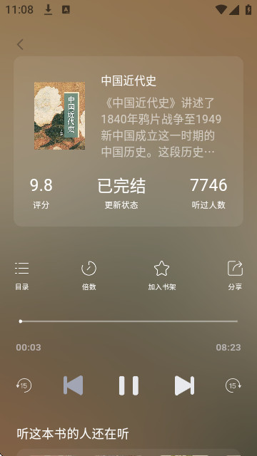 展示了极简的听书界面,简洁的界面可以让你实现无广告的打扰,便捷的听书。