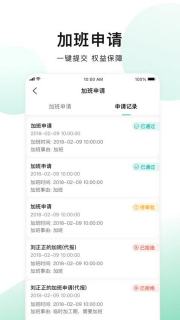 软件支持用户可以随时提交加班申请,对每天的加班时间可以一键申请,快捷提交加班申请。