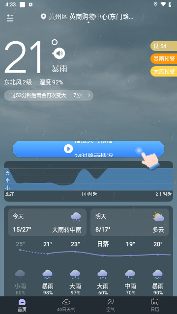 1、小时级预报:提供了小时级的天气预报,我们可以知道接下来几个小时内的天气变化。