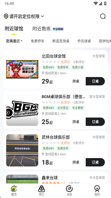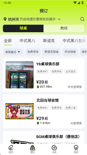 1、打开应用就可以定位查看附近的台球馆,找到需要的品质球馆。