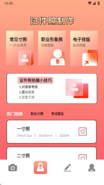 支持用户可以对需要的证件照进行制作,让你可以随时制作出电子证件照,选择常规尺寸来进行制作。