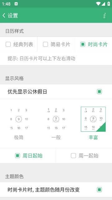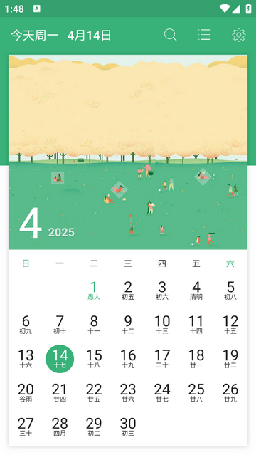1、日视图:显示农历、黄历、当月节气和待办事件