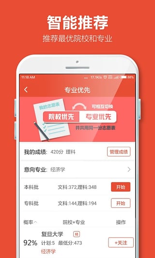 2、院校优先填报:依据院校历5年的录取分数,结合智能推荐算法,推荐录取率高的院校。