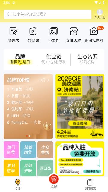 CiE美妆创新展app是由品观科技(武汉)有限公司推出的一款美妆行情资讯app,是女人美妆资讯查看找货的首选,品观app海外直采,品牌官方授权;海关监管,打破传统层层代理模式。它是值得信赖的化妆品产业信息服务平台,为所有化妆品从业者提供及时且有效的信息服务,相关权威资讯和货源渠道以及教程学习平台。