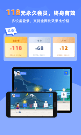 两台设备:支持两台设备同时登录,平板手机任意切换,同步学习进度,家长可随时查看小朋友的学习情况。