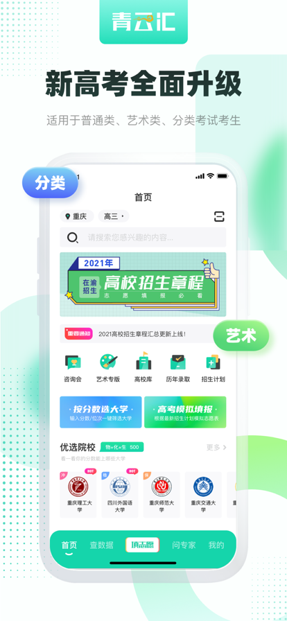 青云汇:教育+互联网升学指导平台!由重庆市高等教育学会普通高校招生专业委员会指导、昭信教育主导开发。专注高中升学服务,全方位为考生的志愿填报保驾护航,帮助考生解决如何填志愿、挑大学、选专业的难题。