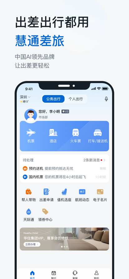 慧通差旅是一款专为企业打造的商旅移动客户端,涵盖企业公务出行的差旅管理、机票、酒店、火车票、打车预订功能,是企业员工出差的差旅管家;同时支持企业员工的个人出行,旅游度假自由行,随时随地订票!