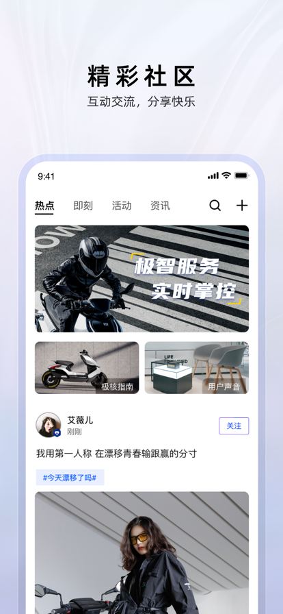 --你可以实时获取电摩信息,实现人车全天候连接,结识同地区的摩托车朋友。用户可以通过社区分享精彩生活,让生活变得更加有趣。