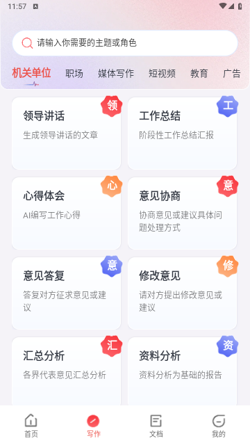 1.公文写作:能够根据您的需求,自动生成工作报告、心得体会、通知公告等多种专业文体。无需再为公文格式和内容而烦恼,轻松应对各种写作场景,提升写作效率。