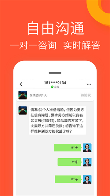 一对一沟通功能,支持用户与律师在线一对一聊天,两者交流的信息只限于两人知道;