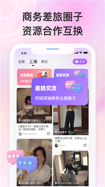 在泡泡差旅上,你可以通过在泡泡上打卡入住酒店、分享旅途精彩见闻,发现同城差旅者,认识有意思的人。