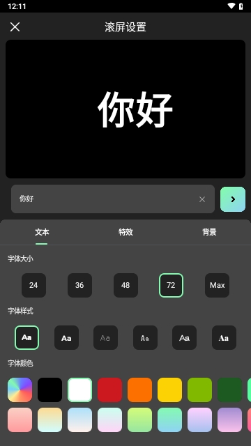 LED显示屏灯牌APP是一款非常好用的手持LED弹幕制作工具,这款软件可以帮助大家来轻松完成LED显示屏制作使用,操作起来非常的简单,大家可以自由编辑使用,字体、字号、颜色、背景等多种参数都是可以来参数使用的,有需要的话快来下载吧!