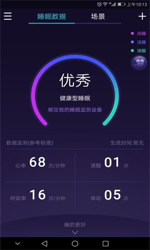 2、注册好账号后,主页面采用了深色调设计,分左右两个界面,左界面是睡眠数据,在这里可以直观定性的看到你的睡眠参数,右界面是场景,在这里可以看到所需绑定的设备和是否开启场景