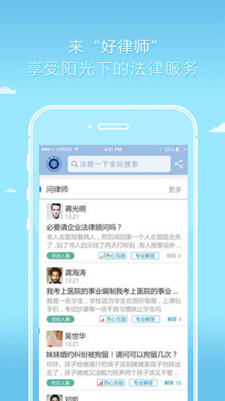 好律师app是一款掌上法律O2O服务软件,通过该软件我们可以在线咨询资深律师,在这里律师可以在线快速的回答客户提出的法律问题,与用户在线进行面对面的视频沟通,分析透彻,观点严谨,对用户的问题进行全面解答,有需要的朋友赶紧下载吧!