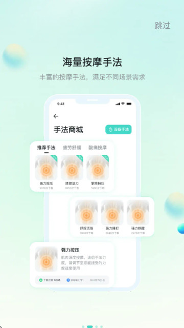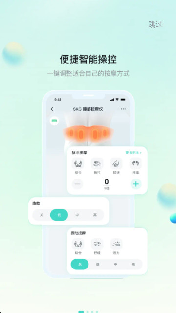 设备与APP连接后,可以更便捷、智能地控制您的设备,APP内置更多专业按摩方法,带给您更丰富、健康的按摩体验,固件更新使您的设备始终*先体验SKG最新研发成果。