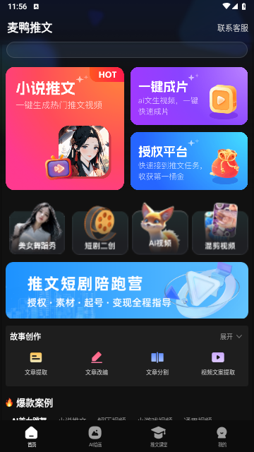 一键创作短视频:用户无需具备专业的视频剪辑技能,只需简单操作,就能生成高质量的短视频。无论是用于小说推广、教育应用还是广告营销,麦鸭推文都能满足你的需求。