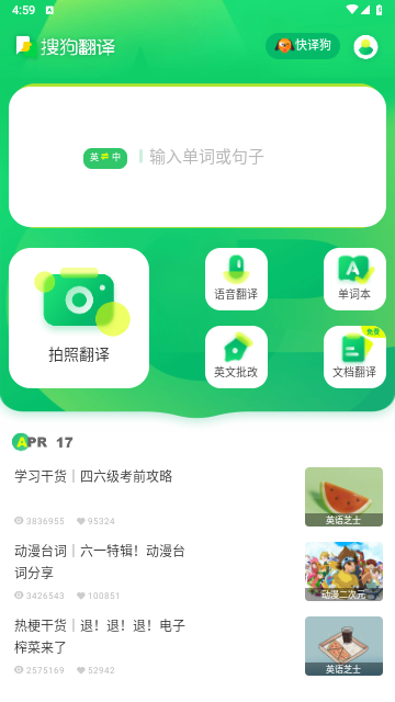 拍照翻译:搜狗翻译支持拍照翻译功能,用户可以通过拍照识别图片中的文字并进行翻译。这一功能适用于旅行、购物、学习等场景,方便快捷。