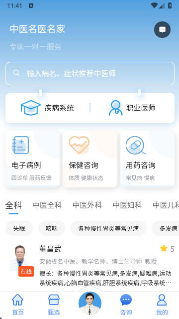 2.推荐有不同科室领域的中医,用户可以选择专科医生咨询看病。