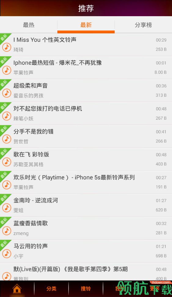 手机端畅享各种免费铃声资源,经典老歌,时尚新区一一为你收录,所有好歌都能为你所拥有,快来下载最新,最好听的手机铃声吧