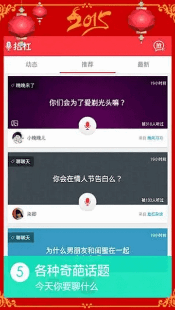 2、杠题:发起或参与你感兴趣的话题,找到附近同类,以语音交流为交友开路。